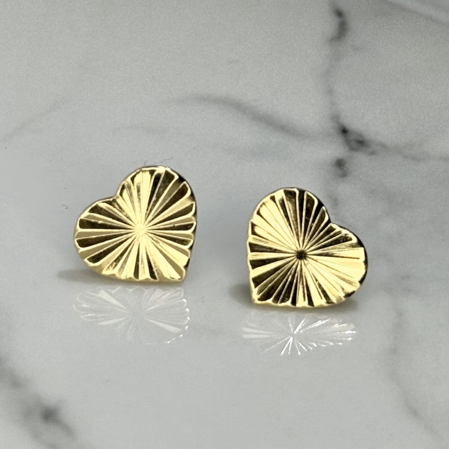 Aros de acero dorado con disño de corazón con textura. Cierre estilo mariposa...
