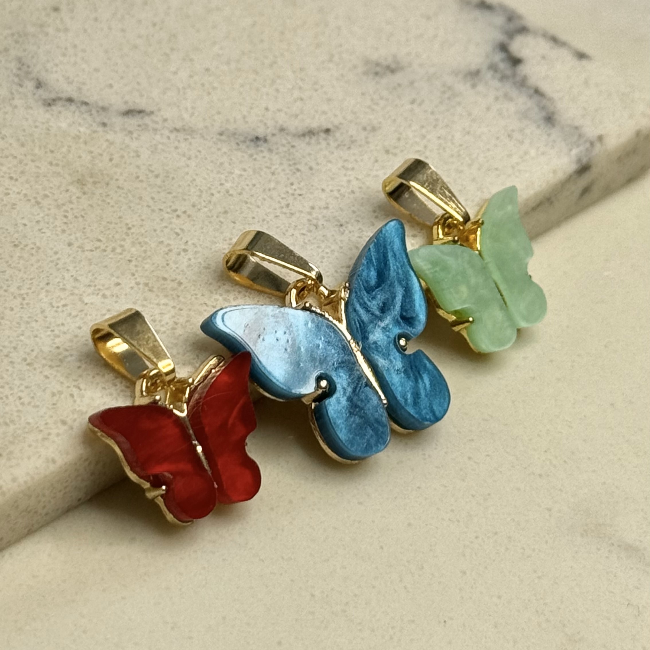 Dije de acero dorado en forma de mariposa. Disponible en tres colores...