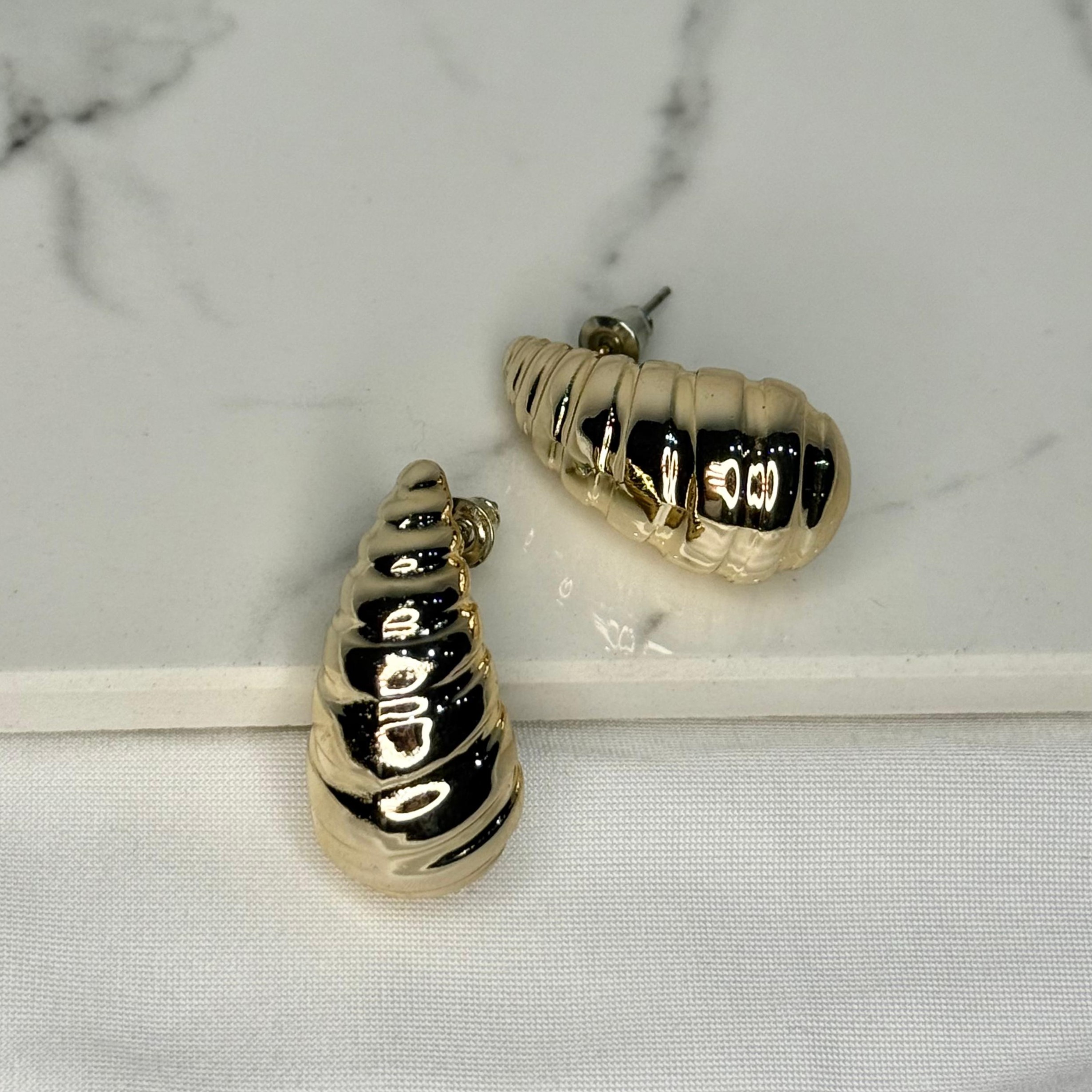 Aros de acero dorado estilo gota con relieve. Cierre tipo mariposa...